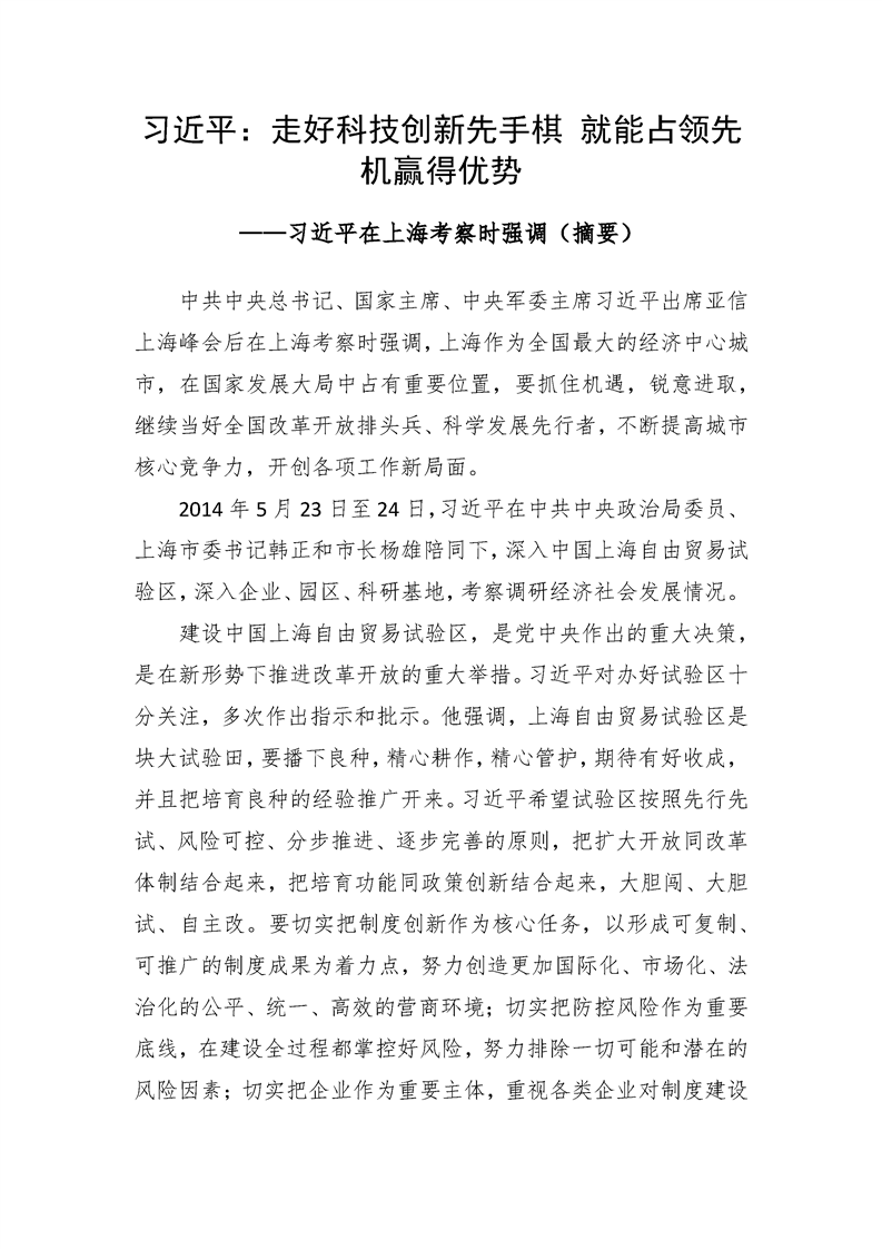 习近平:走好科技创新先手棋 就能占领先机赢得优势——习近平在上海考察时强调
